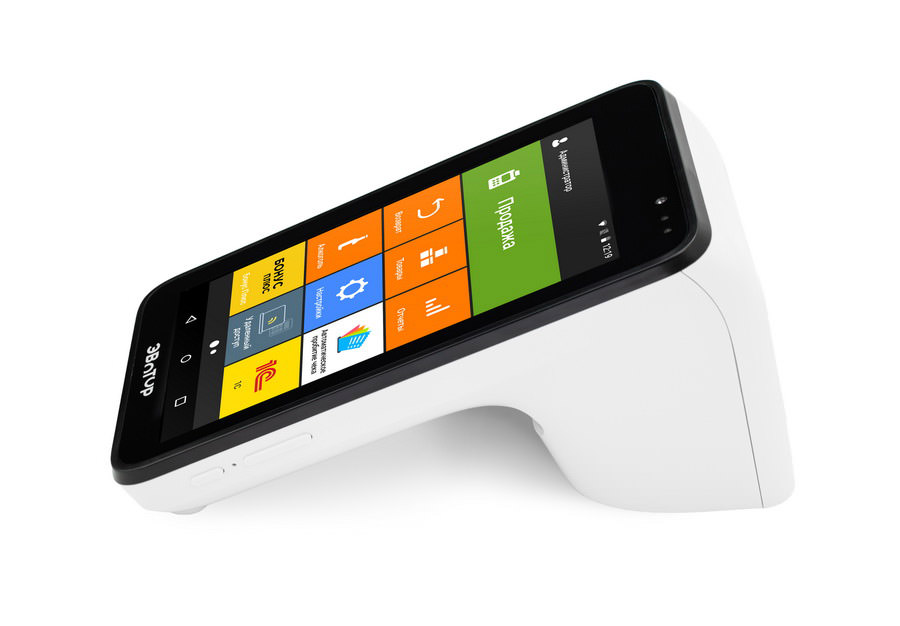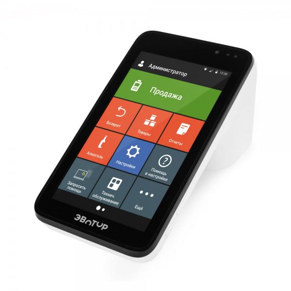 Терминал «Эвотор» — это отличный вариант контрольно-кассового оборудования, идеально подойдет для небольшой организации. Разработан для работы с 54-ФЗ. Представляет собой экономичное решение, в котором совмещается POS-компьютер с сенсорным дисплеем, а также онлайн касса с встроенным фискальным накопителем.